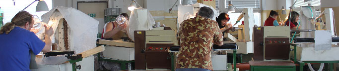 Our glass furnaces have a daily production capacity of 1.2 tons of glass, a chemical polishing facility, cutting workshops and a gilding area.Our products are exported worldwide.